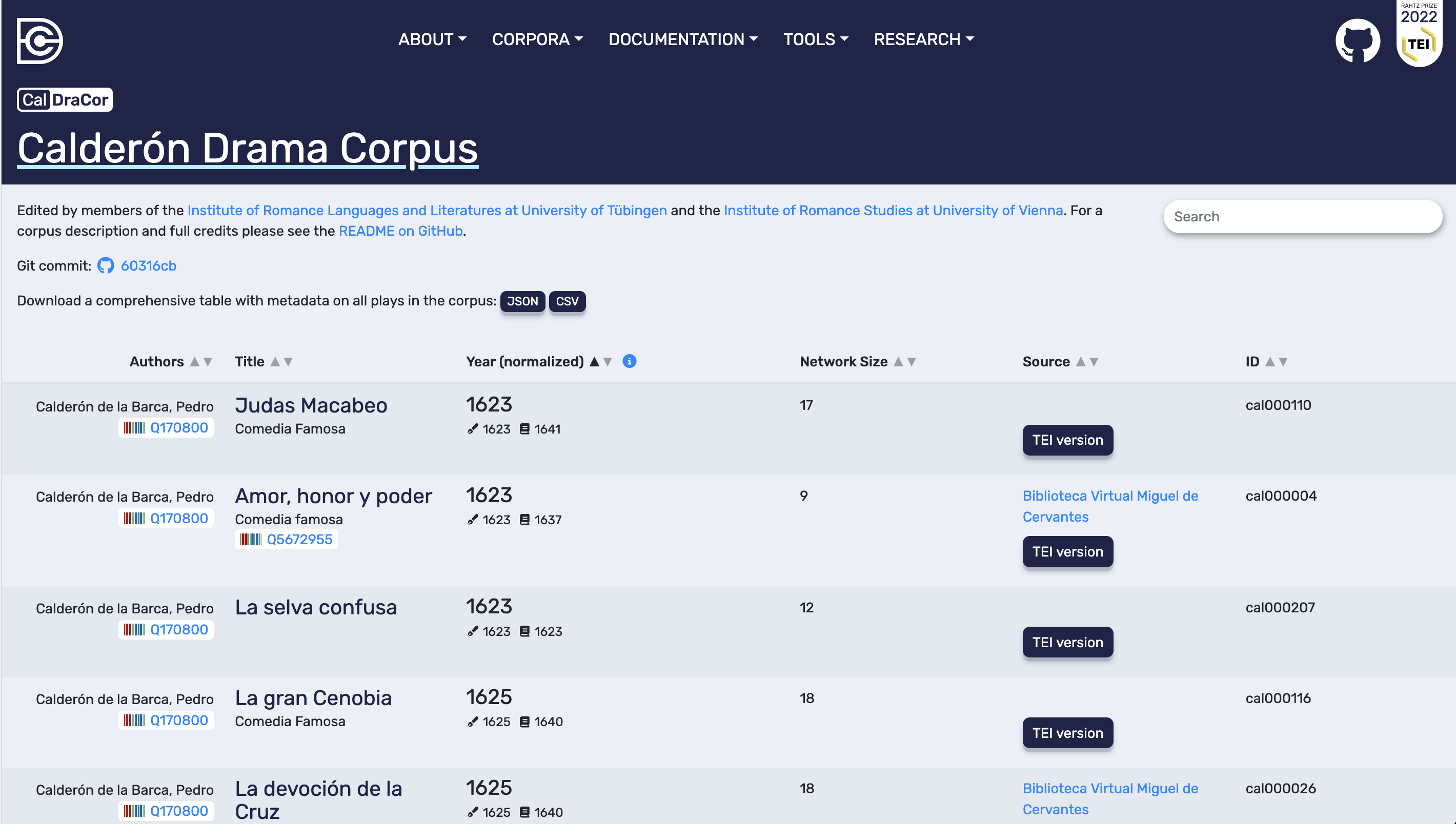 CalDraCor corpus page. The play table can be searched and sorted; corpus-level metadata can be downloaded as JSON or CSV; each play has a stable ID.