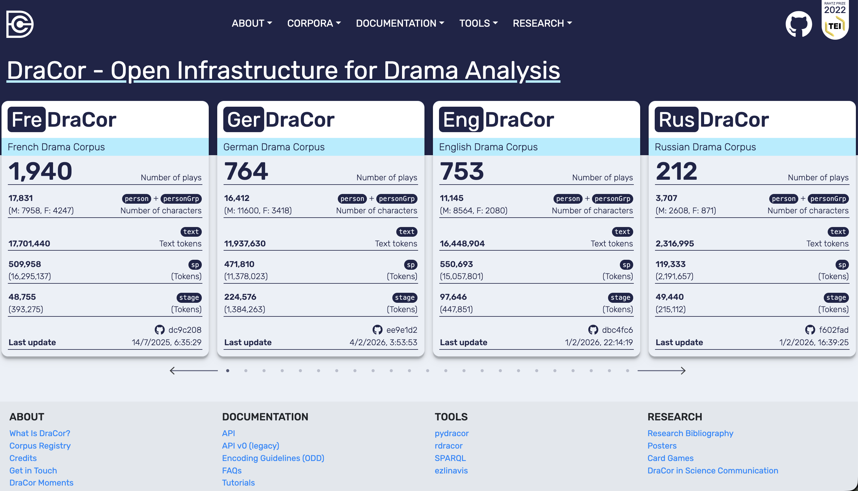DraCor home page. Corpus cards provide a high-level overview (plays, characters, token counts for text/sp/stage, and a last update indicator).
