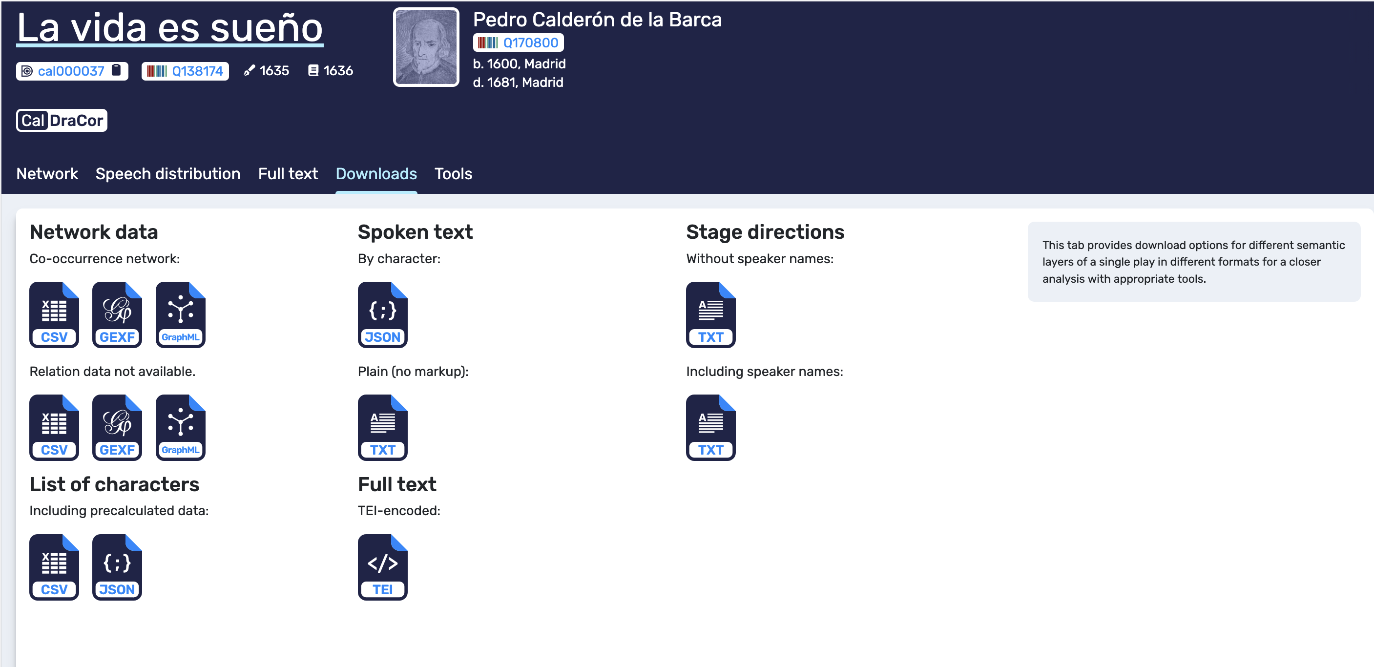 The Downloads tab provides access to different semantic layers of a play in multiple formats. This is the transparency layer of the front-end: it allows us to retrieve artefacts that correspond to what we see in the interface. In the example, network data can be downloaded in common graph exchange formats (CSV, GEXF, GraphML). The tab also offers exports for spoken text (for example, JSON by character and plain TXT), stage directions (with and without speaker names), the character list (CSV/JSON, often including precalculated data), and the full TEI-encoded text.