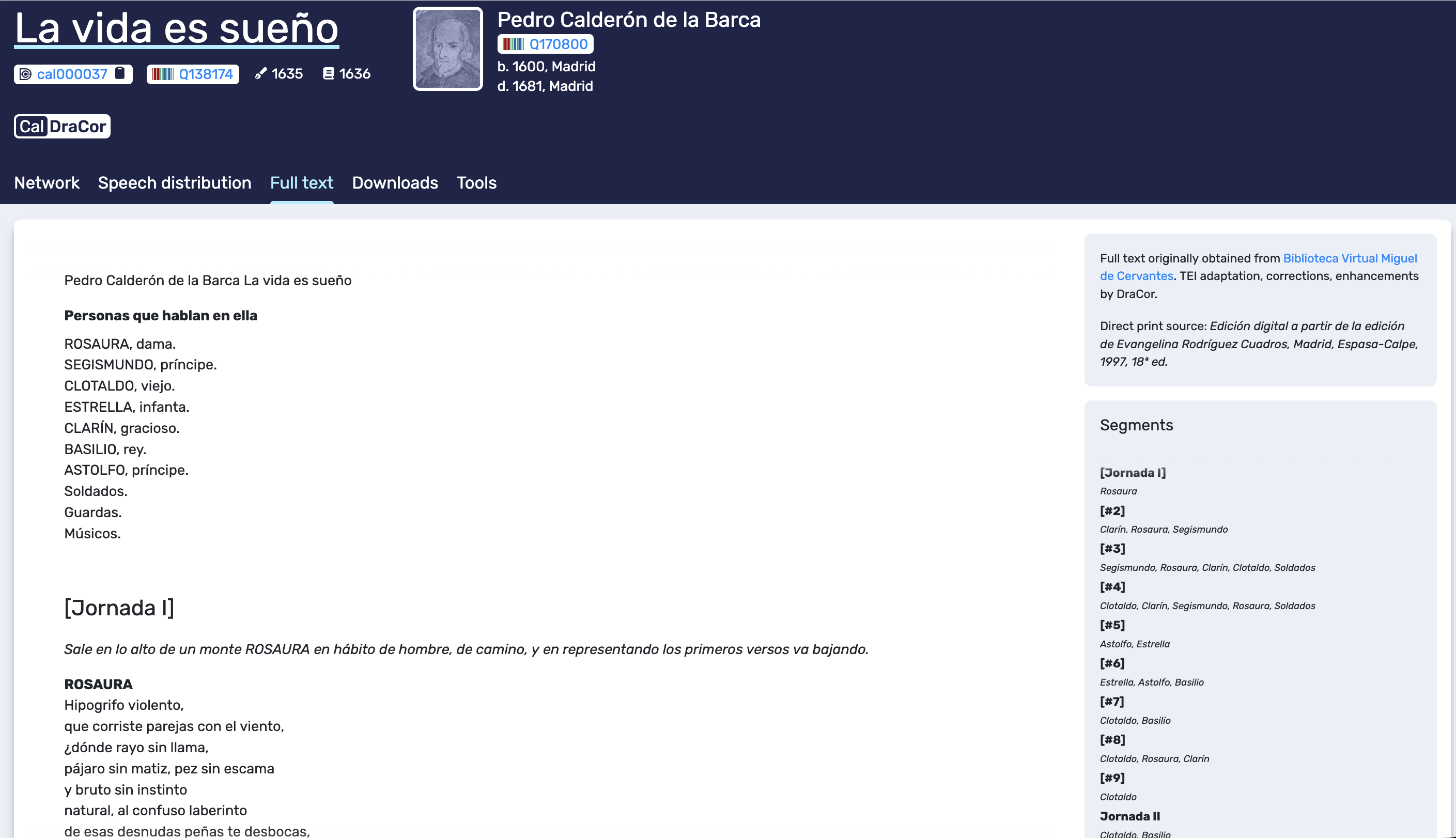 Full text tab. The play text is displayed with provenance notes and a segment list that supports navigation and clarifies the segmentation used in derived views.