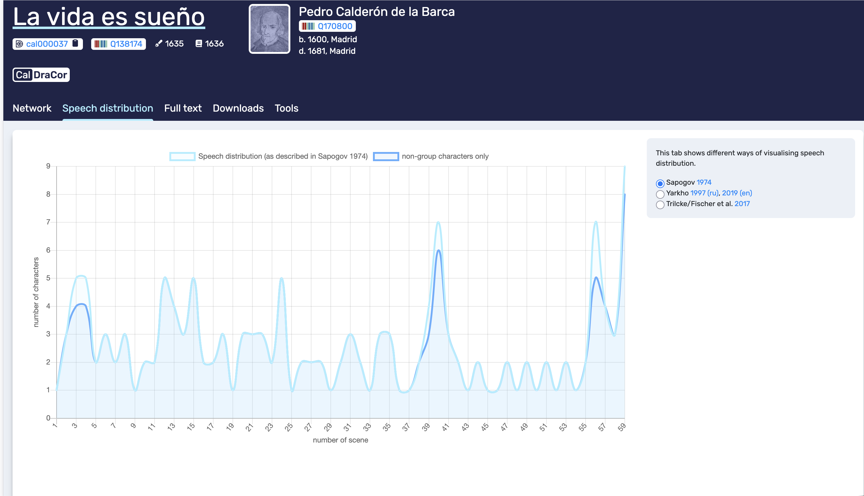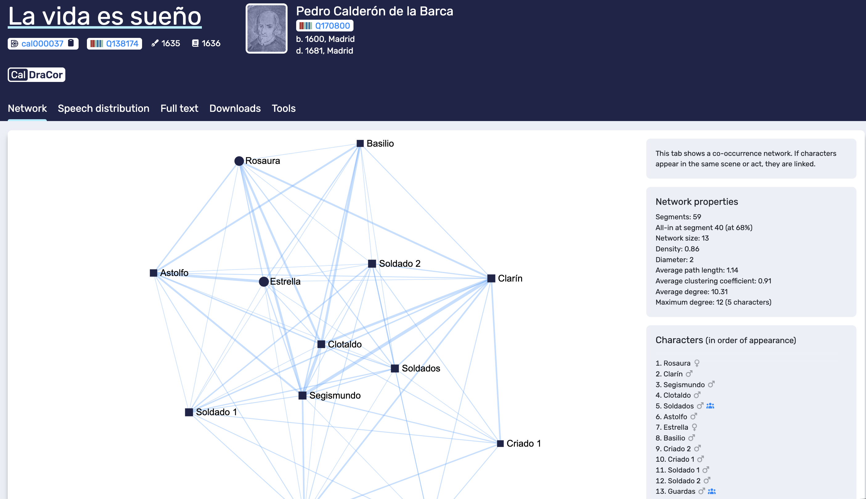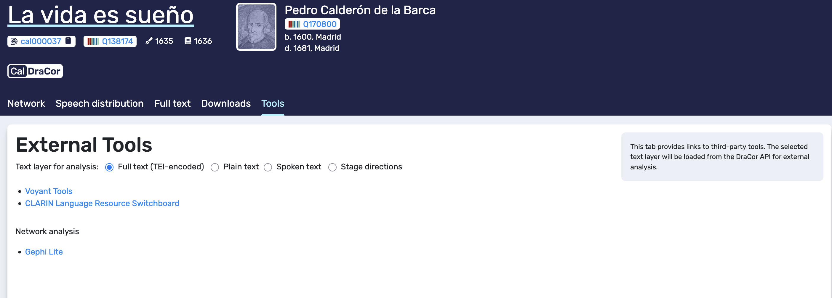 Play pages share a consistent header layout. In the example used in this chapter (“La vida es sueño”), the header shows the play title, the corpus badge (CalDraCor), a play ID, and external identifiers such as Wikidata QIDs for the play and author. These identifiers matter because they support unambiguous reference and interlinking across systems. Below the header, the play-level navigation tabs are visible: Network, Speech distribution, Full text, Downloads, and Tools. In the rest of this chapter we explain these five tabs in the same order.
